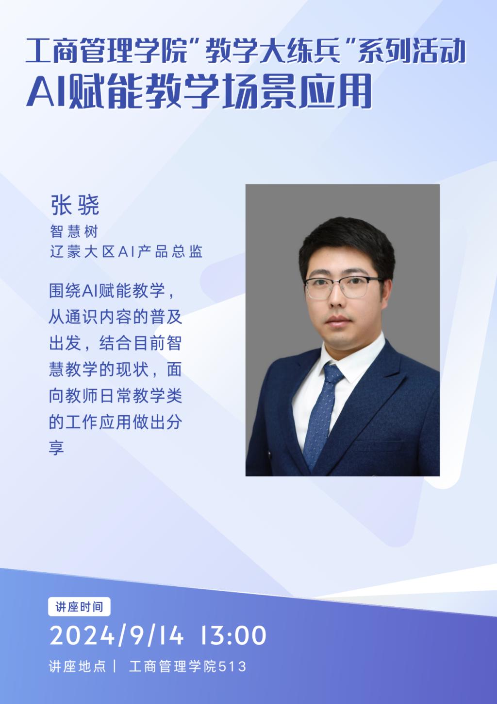 学院邀请智慧树辽蒙大区AI产品总监张骁围绕AI赋能教学议题,从通识内容的普及出发,结合目前智慧教学的现状,面向教师日常教学类的工作应用做出精彩分享。报告由AI通识交流、教学场景赋能和生成式AI的推展应用等三部分构成,对AI在课程建设、课堂教学、线上教学、教师备课等最新教育应用进行了系统性介绍,对数字人、文件快速整理、AI生成PPT、AI文生图、AI视频、文生音乐等进行了重点讲解。