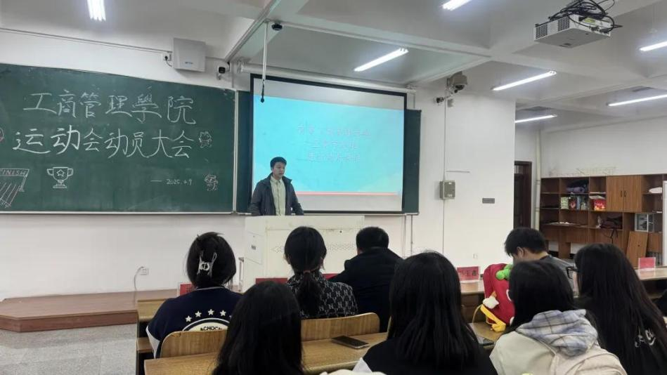 为激发学生参与热情,营造积极向上的体育氛围,4 月 9 日下午,乐竞体育工商管 理学院在明德楼 D308 召开校运会动员大会。学院党委副书记汪若水、2024 级辅导员王晨宇 及学生代表出席会议,共同为即将到来的校运会加油鼓劲,倡导以拼搏精神书写青春篇章。