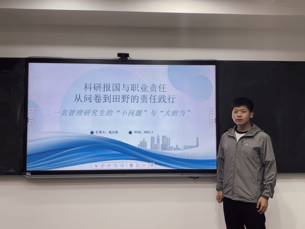 围绕“科学精神与创新思维”模块,研2023级温志强同学以"科研报国与职业责任的双向践行"为主题,通过绿色消费行为研究与鞍山产业转型实践,讲述了管理学者如何将学术研究扎根现实土壤、回应社会需求的故事。他通过312份问卷揭示消费者绿色决策的心理机制,又在鞍山车间发现技术升级与意识培养的双重困境,进而提出"政策-价值-文化"三链融合方案。其核心观点强调:管理研究不应止步于论文发表,而应以解决真问题为导向,在田野调查中校准学术坐标,在政策转化中实现学术价值。这种"用数据解构现象,以方案重塑实践"的研究路径,彰显了新时代学者"把论文写在祖国大地上"的责任担当。MBA2023级常志宇同学从管理学的学科特点出发探讨了研究者的社会责任。他首先从朴素的爱国情感谈起,强调在国家伟大复兴的道路上,通过专业所学报效国家是这代人的使命所在。随后深入分析了管理学研究的特殊性——与自然科学不同,管理学研究直接影响着员工生活、企业兴衰乃至产业转型,错误的理论可能带来严重后果。基于此认识,提出科研需要德行支撑,并明确了工商管理领域的三条职业责任底线:数据与方法透明、利益冲突披露以及社会影响评估。通过个人管理实践经验,说明了管理学研究对小微企业的重要意义,并强调在AI时代要避免过度依赖大语言模型,保持独立思考。他将爱国情怀与职业规范比作"双轮驱动",认为两者相互嵌套、缺一不可,展望在发展低碳经济与新质生产力的背景下,管理学研究者应通过组织创新推动产业转型,用扎实的研究回应时代之问,用赤诚的初心书写报国华章。最后,他结合时事,用华为自研芯片带来的影响以及西方态度,从大国博弈角度支撑了自己的观点,认为科研报国与职业责任的兼顾是应当且必须的事情。