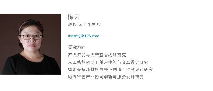 梅云教授,鲁迅美术学院艺术硕士。具有丰富的理论教学及设计实践经验,先后主讲工业设计多门全体系课程,主讲本科核心课程《产品开发设计》、《产品设计 3》、《造型材料与工艺》、《品牌 VI 设计》、《设计战略与市场营销》等。研究生教学先后主讲《设计研究课题 1》、《设计研究课题 2》、《品牌战略研究》等课程。指导研究生多次荣获国家级奖学金及校级优秀研究生。主持辽宁省教育厅科研基金项目 2 项、辽宁省资源共享课建设 1 门、鞍山市科技项目 1 项、参与国家“863 ”项目 1 项。作为项目负责人与省内外多个上市企业公司及政府事业单位开展多方面项目合作,完成十余项横向项目,项目经费总计超过 150 余万元。出版专著 2 部,校级优秀教材 1 部;在国内外期刊公开发表学术论文 30 余篇, 申请实用新型专利 3 项,外观设计专利4 项。指导学生荣获国家级、省级专业设计奖项近百项,其中国家级一等奖及辽宁省创新创业大赛一等奖十余项,省级挑战杯银奖等。荣获乐竞体育优秀创业能手;乐竞体育毕业设计优秀指导教师;辽宁省工业设计大赛优秀指导教师;辽宁省自然科学学术成果二等奖;鞍山市科学学术成果奖一等奖。中国工业设计协会个人理事,辽宁省工业设计协会理事;四川省工业设计大赛评委,辽宁省三维设计大赛评委;国家级某知网检索期刊杂志编委。AEIC学术交流中心材料机械系列会议组委员会专家组成员。