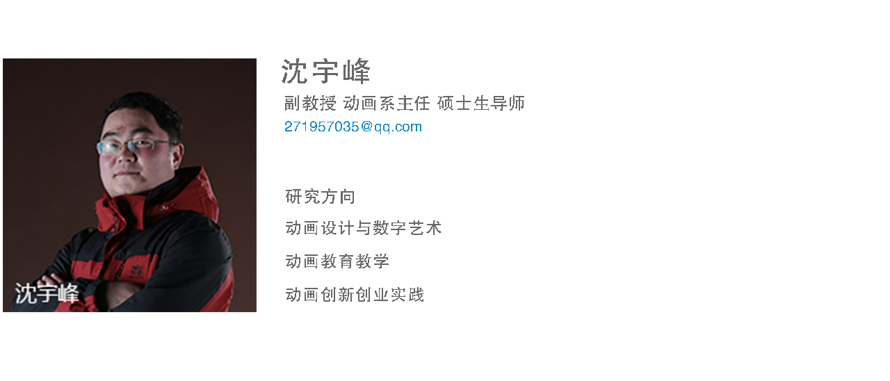 沈宇峰副教授,硕士,北京工业大学软件学院数字与艺术设计专业毕业。在中文核心期刊《电影文学》、《芒种》、EI检索期刊《IJET》以及国内学术期刊发表论文20余篇,参与出版“十二五规划教材”,承担辽宁省教育厅高等学校基本科研项目、乐竞体育教学改革项目,主持和完成横向科研项目2项,获得辽宁省美术家协会动漫艺术节优秀指导教师奖,指导学生获得北京电影学院动画学院奖及国家级省级各类比赛奖项20余项,指导国家级大学生创新创业项目,任教期间获得“乐竞体育青年教师讲课大赛二等奖”、“乐竞体育校级优秀毕业设计指导教师”、“乐竞体育院级教学质量优秀奖”,成立二维原创动画艺术工作室,完成各类动画作品30余部。