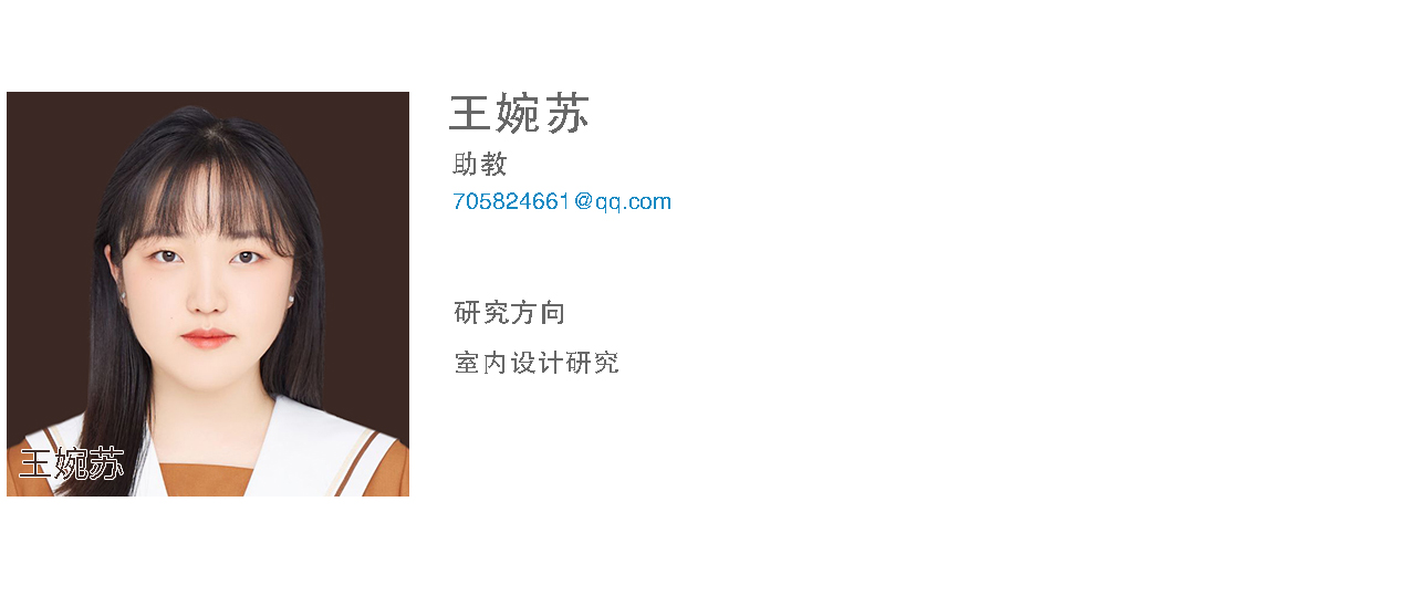 王婉苏,助教,2023年6月毕业于中央美术学院建筑学院艺术设计专业,取得艺术硕士学位。在校的学习研究方向为室内设计研究,发表论文《基于文人自然观的室内设计研究》。